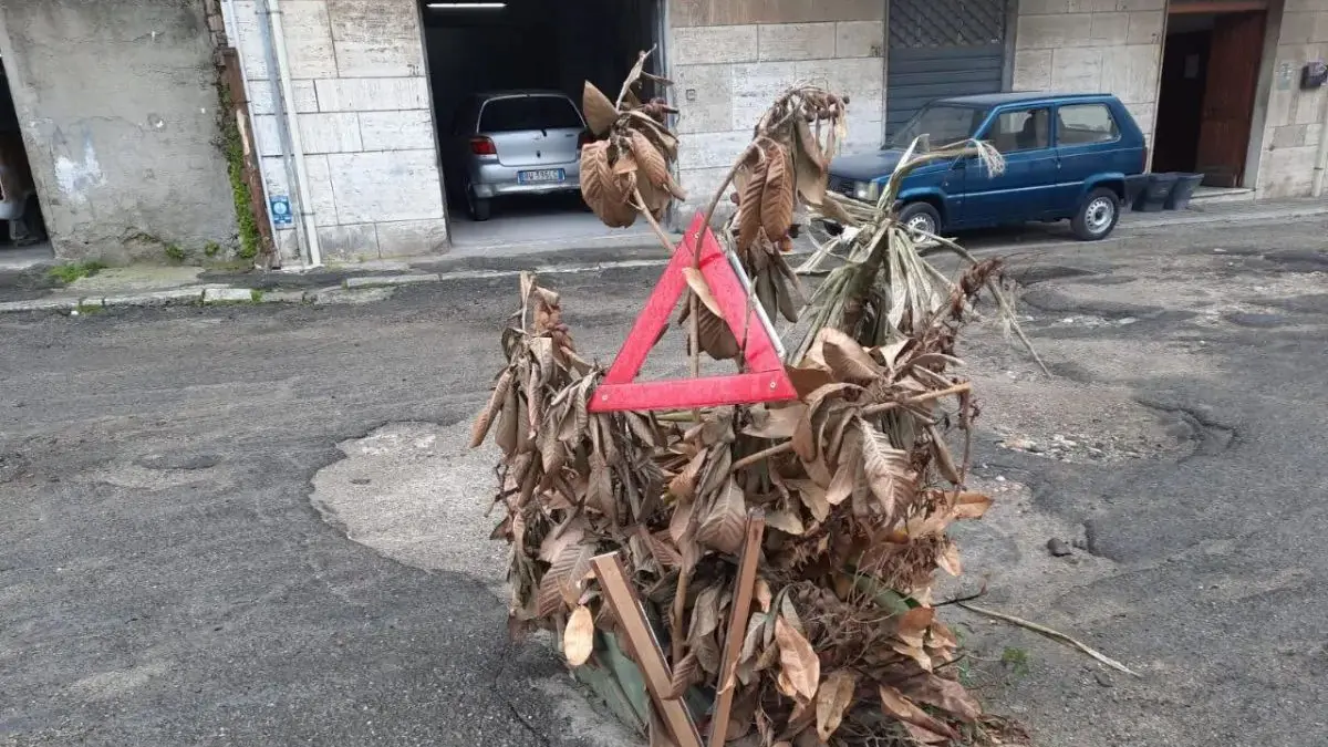 Nella strada dissestata i cittadini hanno piazzano un albero per coprire la voragine. Onde scongiurare pericolosi incidenti è stato piazzato anche un triangolo rosso per avvertire gli automobilisti.