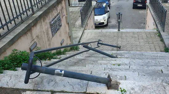 Ci sono ancora chiari i segni della nottata trascorsa nella strada che incrocia la via Filippini con la via Palamolla. Una ringhiera della scalinata che collega le due vie è stata infatti divelta da parte di vandali che hanno approfittato dell’ora notturna per portare a compimento un’azione avviata già da altri poco tempo prima.