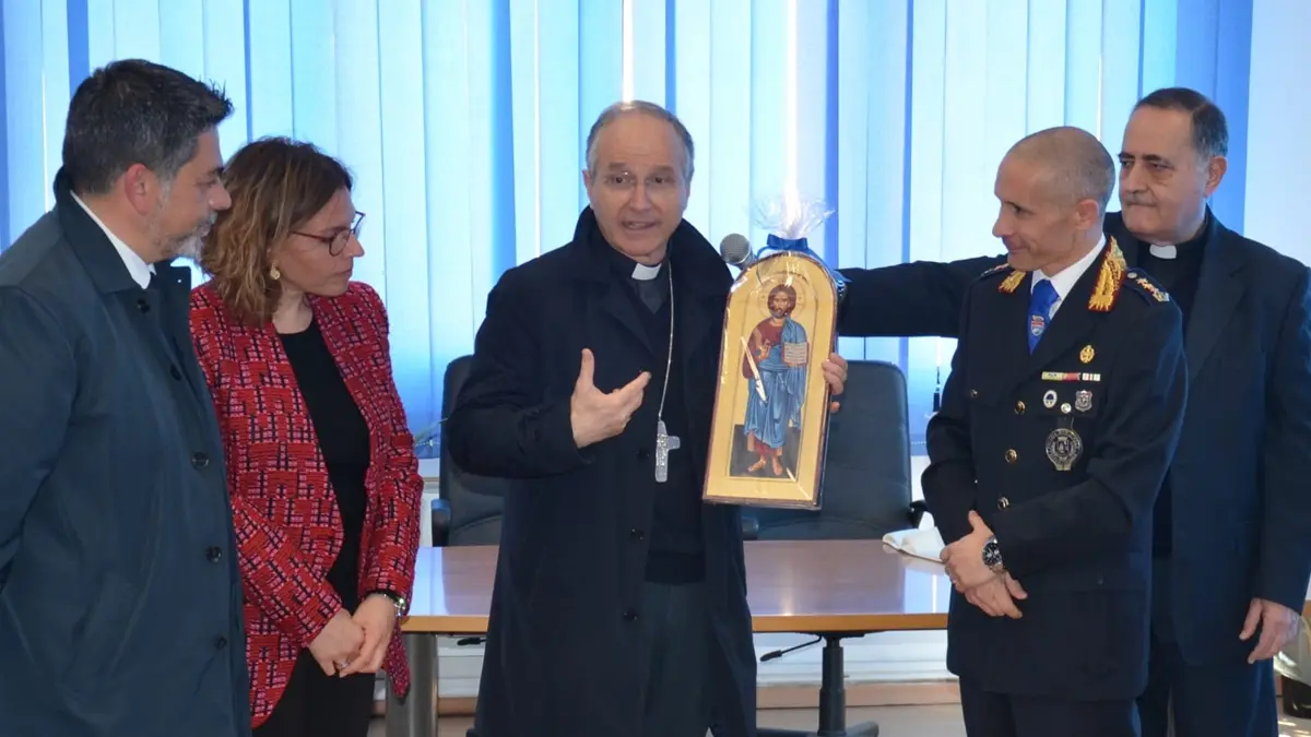 L’alto prelato, accompagnato dal Cappellano del Corpo, Don Marco Scordo, è stato accolto presso la sede di viale Aldo Moro, dal Sindaco f.f. Paolo Brunetti, dall’Assessore alla Polizia Municipale Giuggi Palmenta, e dal Comandante Salvatore Zucco.