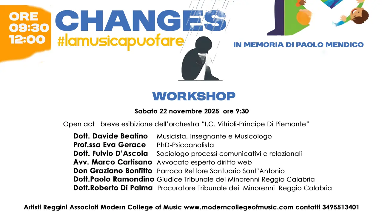 Sabato 22 novembre alle ore 9:30 all’Auditorium Don Orione in piazza Sant’Antonio a Reggio Calabria in ricordo di Paolo Mendico, l’A.R.A. Artisti Reggini Associati, organizza un workshop sull’educazione emotiva denominato “CHANGES, la musica può fare”, un incontro che coinvolgerà gli istituti scolastici reggini con docenti e studenti, ma aperto anche al pubblico. Professionisti esperti nei vari settori di pertinenza della lotta al bullismo, relazioneranno sulle loro esperienze ed interagiranno con il pubblico.