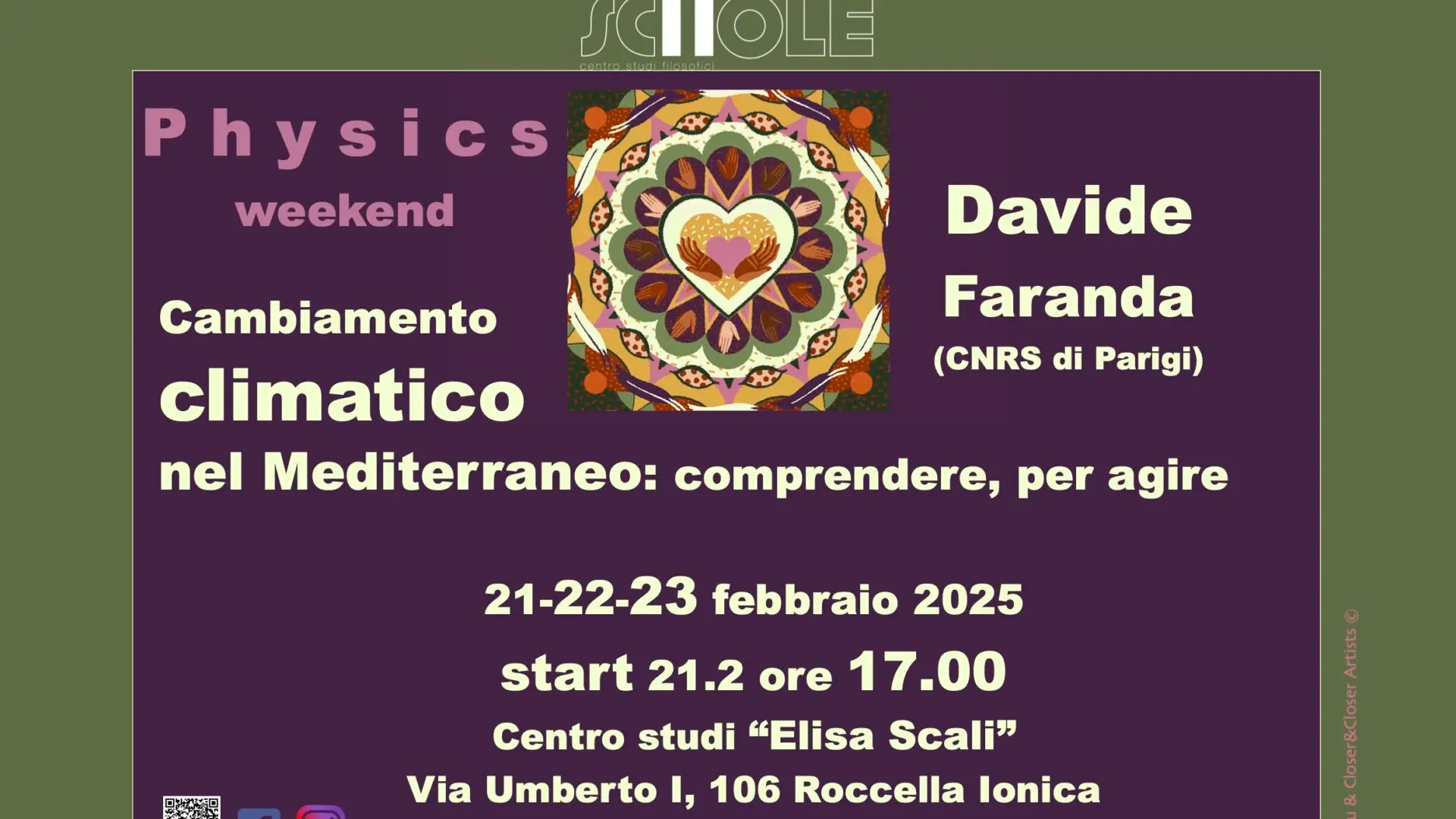 Nel weekend del 21, 22 e 23 febbraio, con inizio venerdì 21 alle ore 17.00 nel Centro Studi “Elisa Scali” di via Umberto I, 106, a Roccella Jonica, Faranda affronterà la fisica del cambiamento climatico, con lo sguardo rivolto alle conseguenze sull’incidenza di eventi estremi ma anche in relazione alle pratiche che è possibile adottare come collettività per mitigarne gli effetti. In questo caso la zona rossa sul planisfero che è oggetto di riflessione ci tocca da vicino: è la fascia Mediterranea, una delle zone più vulnerabili agli effetti del cambiamento climatico.