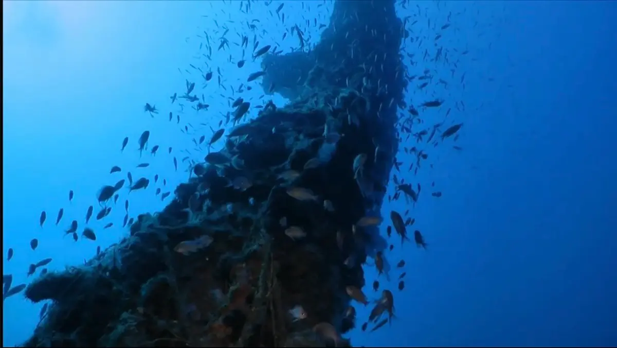 Grandi cernie tra le lamiere e tutte le strutture emerse della nave abitate da spugne e grandi spirografi, alghe e briozoi, anellidi, madrepore, con un brulicare di invertebrati, pesci come sciarrani, perchie e nuvole di anthias che danzano intorno al relitto costantemente. La natura si è fusa con esso. Particolarmente suggestivo è l’albero della nave. Esso si erge dal fondale. Dei quasi 50 metri di profondità si avvicina alla superficie del mare con i suoi quasi venti metri di altezza.