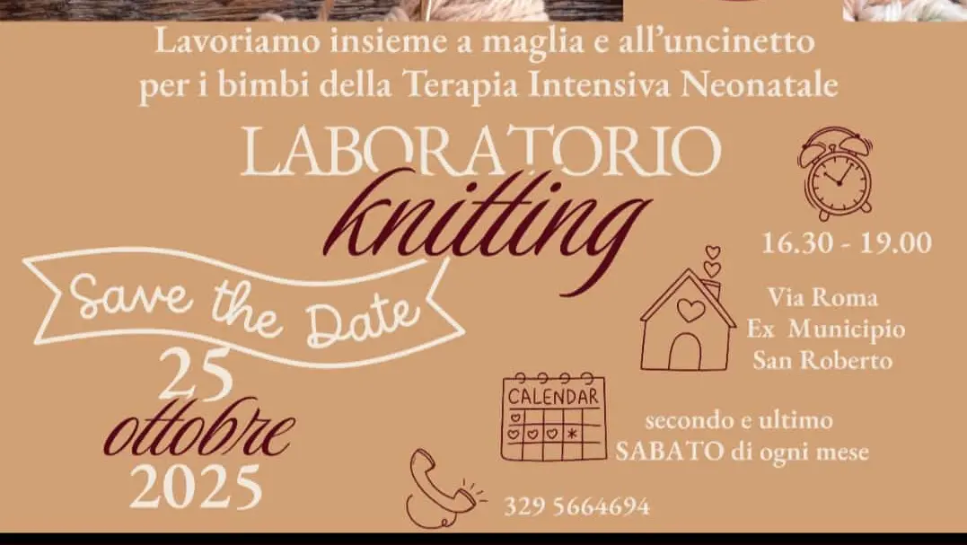 In questo contesto si inquadra l’iniziativa messa in campo tra l’associazione "Nido dei Nonni" e l’associazione "Cuore di Maglia", con il patrocinio del Comune di San Roberto. Infatti, a partire dal 25 ottobre, il secondo e ultimo sabato di ogni mese, le associazioni daranno vita a un laboratorio knitting, dedicandosi alla creazione di lavorazioni a maglia e all’uncinetto per la Terapia Intensiva Neonatale.