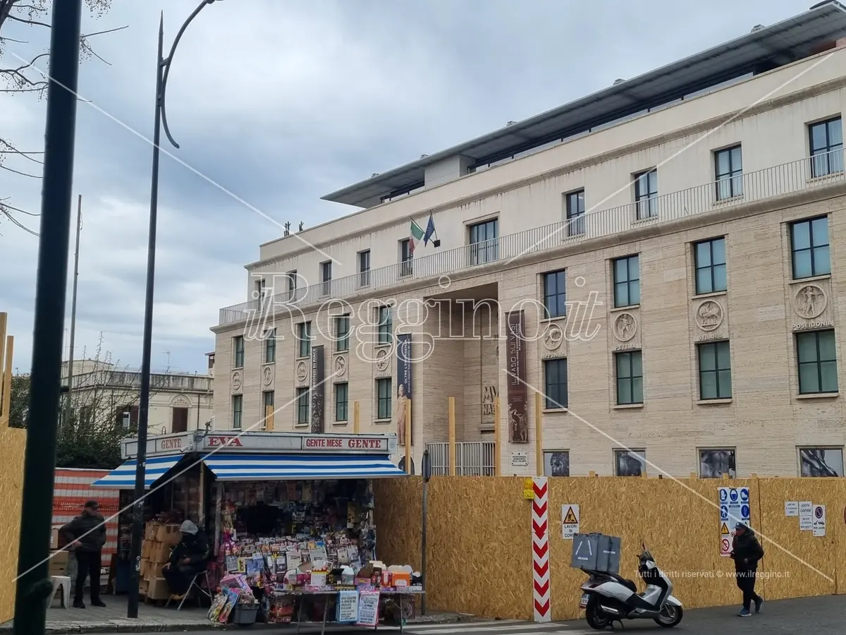 Intorno al recinto, ma solo davanti all’ingresso del museo, è stata sistemata una speciale copertura “a tema”. Le immagini utilizzate per abbellire la copertura, prima anonima, sono quelle dei siti archeologici principali della Calabria: da Capo Colonna fino a Reggio. Splendide immagini a colori che cercano di restituire bellezza e dignità al luogo.