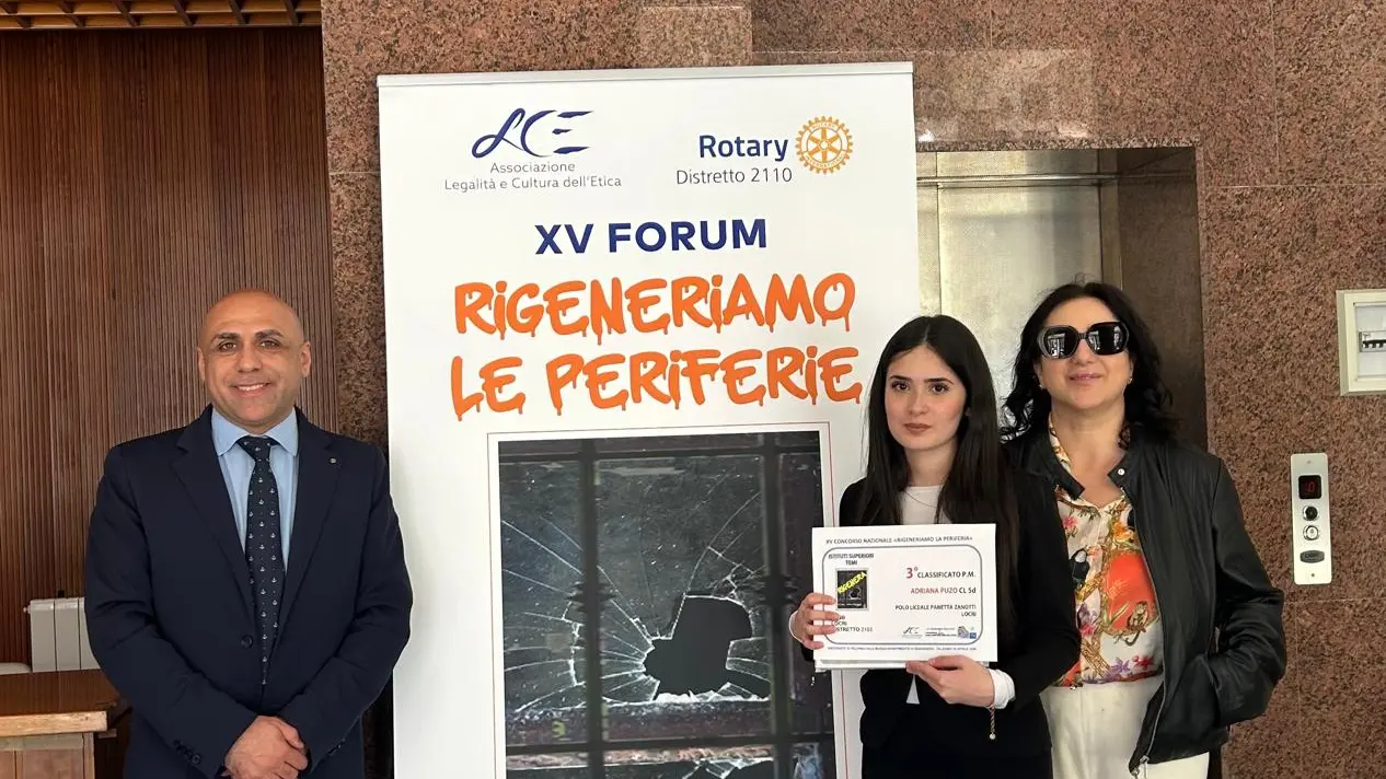 Orgoglio e soddisfazione per Adriana Puzo, classe 5D, del Liceo Classico “Ivo Oliveti”, plesso del Polo Liceale di Locri “Zaleuco - Oliveti - Panetta - Zanotti”, guidato dalla Dirigente Carmela Rita Serafino, che si aggiudica il terzo premio, alla XV Edizione del Concorso Nazionale “Legalità e Cultura dell’Etica”, nella sezione “elaborato scritto”, indetto dal Rotary International, nello specifico il Distretto 2110 (Sicilia e Malta), con il Patrocinio dell’Università degli Studi di Palermo, in cui, nell’ Aula Magna della Facoltà di Ingegneria, si è svolta la cerimonia di premiazione, venerdì 10 Aprile. All’evento hanno partecipato i presidenti dei vari Club Rotary da dove provenivano i vincitori, per Adriana, che faceva parte del Distretto 2102, è stato presente l’Avvocato Roberto Trimboli, Presidente del Rotary Club di Locri.
