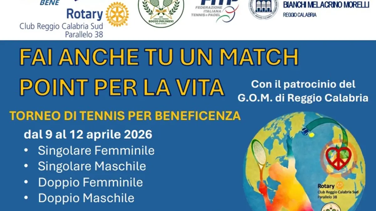 Quattro giorni di sport e impegno sociale per trasformare ogni scambio in un gesto concreto di aiuto. A Reggio Calabria prende il via il torneo “Fai anche tu un match point per la vita”, iniziativa che unisce tennis e solidarietà con l’obiettivo di sostenere progetti di cura e assistenza dedicati ai bambini.