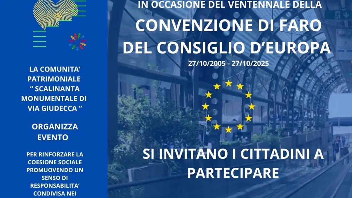 Ci sono luoghi che parlano, che raccontano chi siamo stati e chi vogliamo essere. Uno di questi è la Scalinata monumentale di via Giudecca, cuore pulsante di Reggio Calabria e di una comunità patrimoniale che, domenica 26 ottobre 2025 alle ore 9:00, si ritroverà al tapis roulant per celebrare insieme i vent’anni della Convenzione di Faro del Consiglio d’Europa. Un anniversario che non è solo una ricorrenza, ma un richiamo al senso profondo della partecipazione e della responsabilità condivisa, come recita la stessa convenzione: «Chiunque, da solo o collettivamente, ha diritto a trarre beneficio dall’eredità culturale e a contribuire al suo arricchimento».