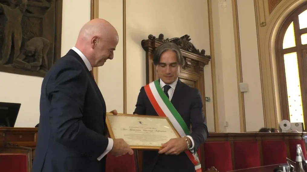 Parole dette col cuore, che seguono quelle del sindaco Falcomatà che ha spiegato il senso di una onorificenza che il Consiglio comunale appena due giorni fa ha votato all’unanimità: «Il presidente Infantino con la voglia di arrivare, con il sacrificio, con l’impegno, con il lavoro, con tutto quello che è il bagaglio del nostro essere calabresi, è riuscito ad arrivare nelle istituzioni dello sport ed è ancora di più la dimostrazione che non è vero che noi siamo nati qua, nell’angolo sbagliato del mondo, non esiste la scusa per arrendersi di fronte al contesto territoriale nel quale si è nati, intanto perché non è vero ma soprattutto perché questo ci fa recuperare ancora di più la dimensione di orgoglio dell’essere nati in questa terra».